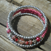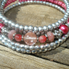(1) 6/0 size silky matte raspberry beads, raspberry glass pearls, silver tone metal accents, rhodonite rondelles, and cherry quartz beads