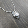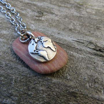 A river rock is topped with a metal and glass crystal charm. On 18 inch stainless steel snake chain