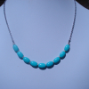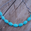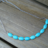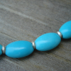10 mm oval blue turquoise colored beads are strung with tiny silvery spacers in between. Finished with stainless steel chain and lobster claw clasp. Necklace hangs 16 inches long. Perfect on it's own or as a layering piece.