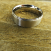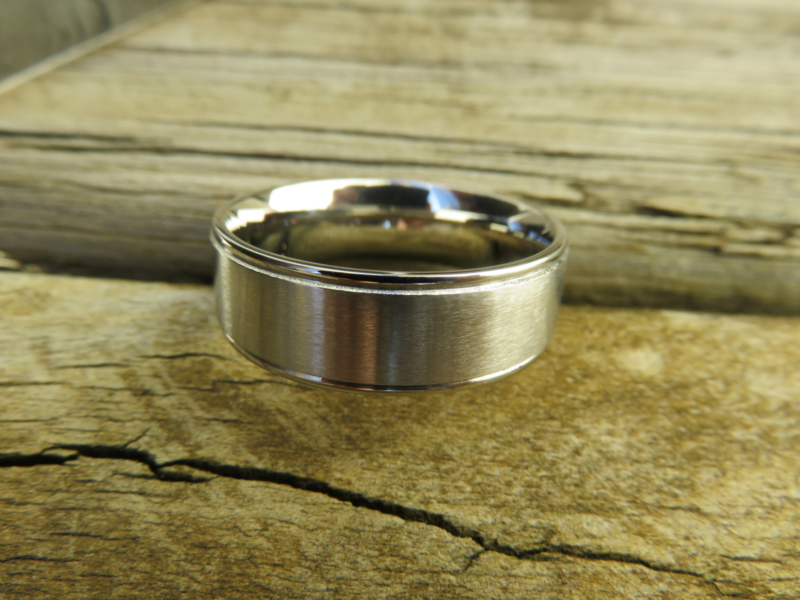 This is a perfect choice for a wedding band or just an everyday ring. 8mm wide. The edges are polished with a brushed finish running down the middle. Really sophisticated. Stainless steel.