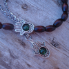 Oval wooded beads on stretch cording with a metal HAMSA charm that contains a tiny green aventurine in the middle. This is made 7 inches long, fits average wrists. If you need a larger one, convo me.