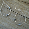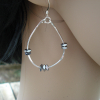 Shiny sterling silver hand formed and hand hammered teardrop hoops have shiny black hemalyke accents beads. 1.5 inches long by 1 inch wide. Sterling silver earwires.
