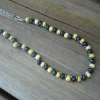 Grogeous Czech glass tear drop beads in dark navy and creamy yellow are combined with tiny black rondelles. On Draping wire finished with stainless steel chain and a lobster claw clasp. Hangs 15.75 inches long.