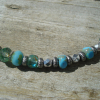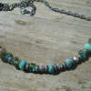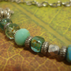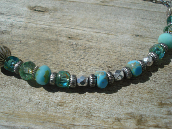 Three and a half inches of gorgeous mixed beads on metal wire - Blues, turquoise color and silver tone. There are metal scalloped beads, Czech glass, and Swarovski crystals. Hangs about 15.5 inches long. Metal chain with stainless steel lobster claw clasp. Stainless steel jump rings.