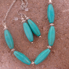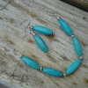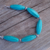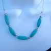 This necklace has pretty oblongs of faux turquoise and silver toned metal beads on a stainless steel chain with steel jump rings and lobster claw clasp. Necklace hangs 18 inches long.