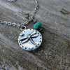 Metal dragonfly charm paired with a summer green czech bead and gunmetal accent drop on an 18 inch stainless steel chain with lobster claw clasp.