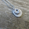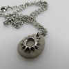 I have many stones to choose from but when I'm designing a piece, they sometimes just come together so perfectly. This stainless sun charm fit perfectly atop this sweet bisque colored river rock like they were just made for each other. The stone measures just under 3/4 inch long. The entire necklace hangs 18.5 inches.