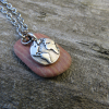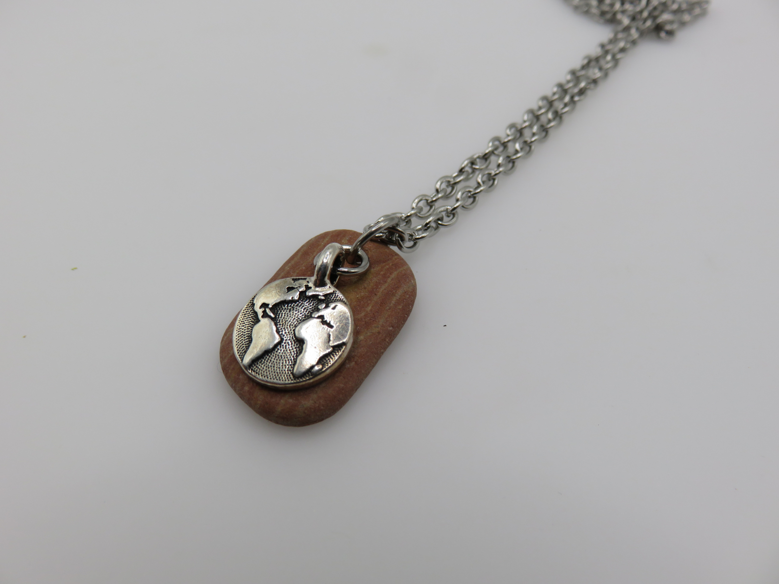The world, on a rock worn around your neck. The river rock is a sor tof reddish-ginger shade with the silvery metal world charm on top. The rock is about an inch long.