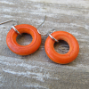 Real wooden ring earrings. This is for the ORANGE ones. These are about 3/4 inch in diameter and hang about an inch in length. Stainless steel jumprings and ear wires. These coordinate with the wooden ring necklaces available in another listing. Different colors available. Please see indiviudal listings for other colors. Model is shown with the dark brown earrings.