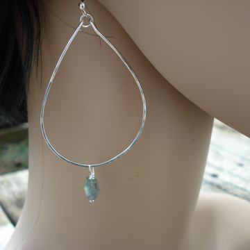 Large Hammered Sterling Silver Hoops with Labradorite drops