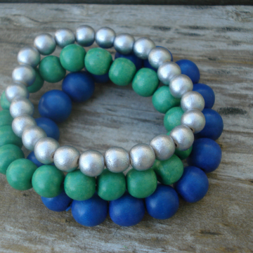 Wood Bracelet Trio (green, blue and silver)
